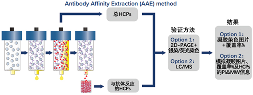 AAE分析流程首先將多克隆抗體共價(jià)固定在色譜柱上。然后對色譜柱進(jìn)行條件調節,以防止抗體的顯著(zhù)浸出并極大地減少任何非特異性結合。原始未變性的HCPs樣品通過(guò)色譜柱與抗體進(jìn)行結合,隨后用酸洗脫。通過(guò)結合和洗脫,HCPs樣品再次在柱上循環(huán),直到?jīng)]有其他HCPs被結合。所有收集的HCPs洗脫液再匯集、交換緩沖液并濃縮回原始樣品體積,為后續的分析提供高質(zhì)量的樣本。在收集到HCPs樣本后,可以選擇通過(guò)2D-PAGE+銀染或MS質(zhì)譜進(jìn)行后續分析。