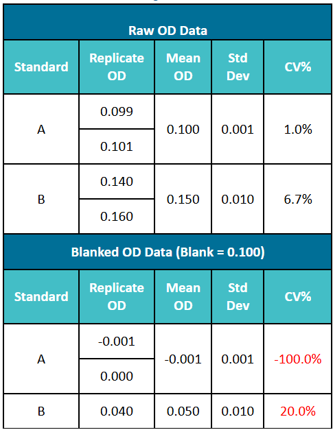 以下示例說(shuō)明了背景值扣除對變異系數的影響。在表1中,標準A的平均OD值為0.100,標準B的平均OD值為0.150 。當通過(guò)原始讀數減去空白對照的OD值來(lái)計算變異系數(CV)時(shí),CV值顯著(zhù)上升,導致標準B的CV%從6.7%增加至20%。