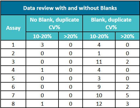 表2. 經(jīng)過(guò)空白對照校正后的CV%與未校正數據的CV%值對比
