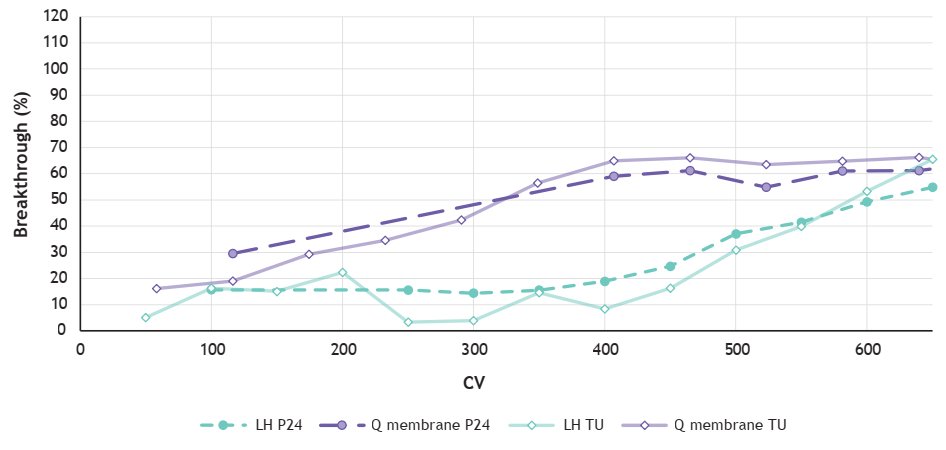 下圖是VSV-G LVV樣品在不同流速下通過(guò)LentiHERO(LH)與Q膜流穿液的TU和p24檢測結果,LentiHERO對LVV的結合能力顯著(zhù)高于Q膜。由此表明,LeniHERO在LVV流穿之前能夠處理更大體積的料液。