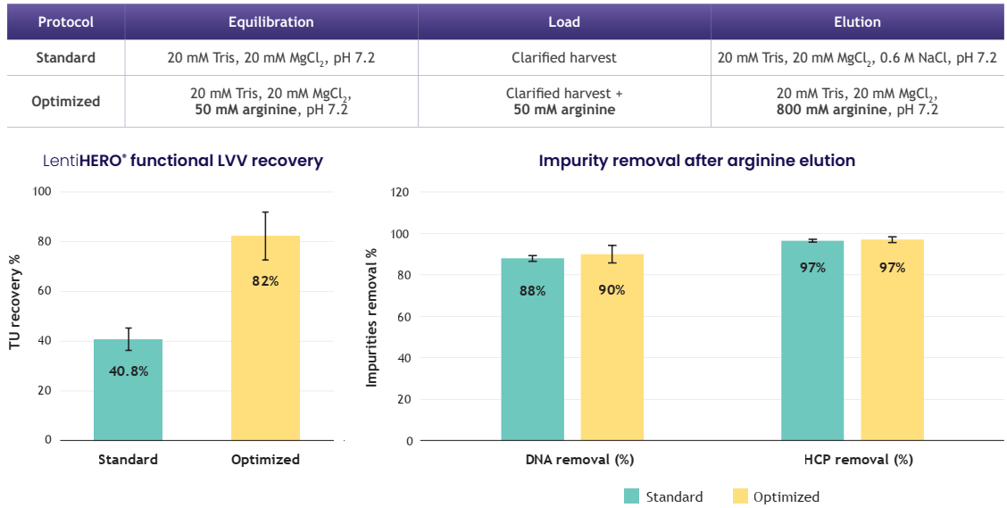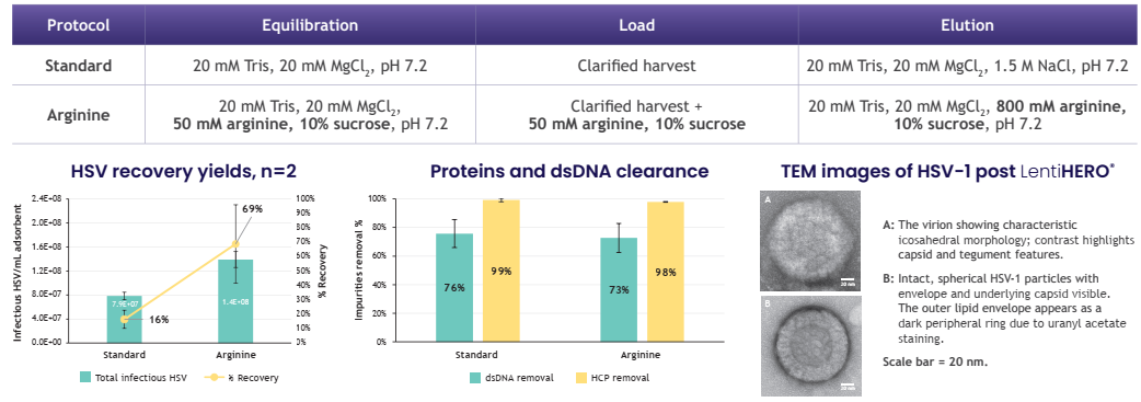 用0.8M精氨酸洗脫,HSV回收率可達到69%,LentiHERO®載量可達1.4E+8 IU/ml,同時(shí)實(shí)現高效的雜質(zhì)去除。
